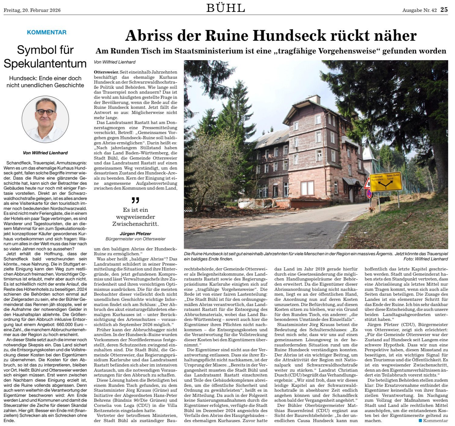 „Nach jahrelangem Stillstand haben sich das Land Baden-Württemberg, die Stadt Bühl, die Gemeinde Ottersweier und das Landratsamt Rastatt auf einen gemeinsamen Weg verständigt, um den desaströsen Zustand des Hundseck-Areals zu beenden. Kern der Einigung ist eine angemessene Aufgabenverteilung zwischen den Kommunen und dem Land, um den baldigen Abriss der Hundseck-Ruine zu ermöglichen.“  (Laut der Pressemitteilung des Landratsamtes Rastatt vom 19.02.2026).